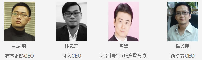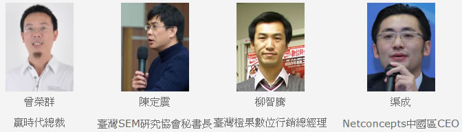 演講:搜索引擎優化案例分析 • 徐鵬,CEO,傳漾科技 • 臺灣企業 • 臺灣 • 鄧廣檮,CEO,互動通 • 姚志國,CEO,有客網路 |
